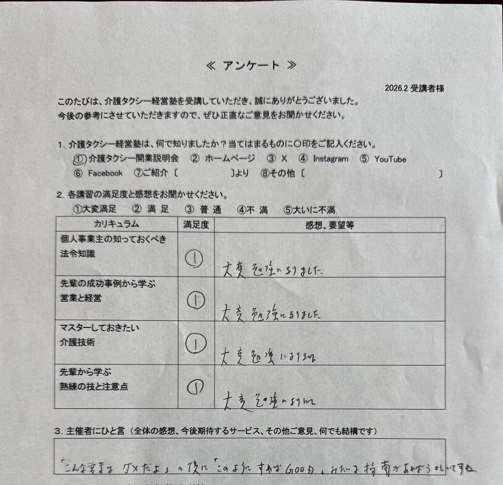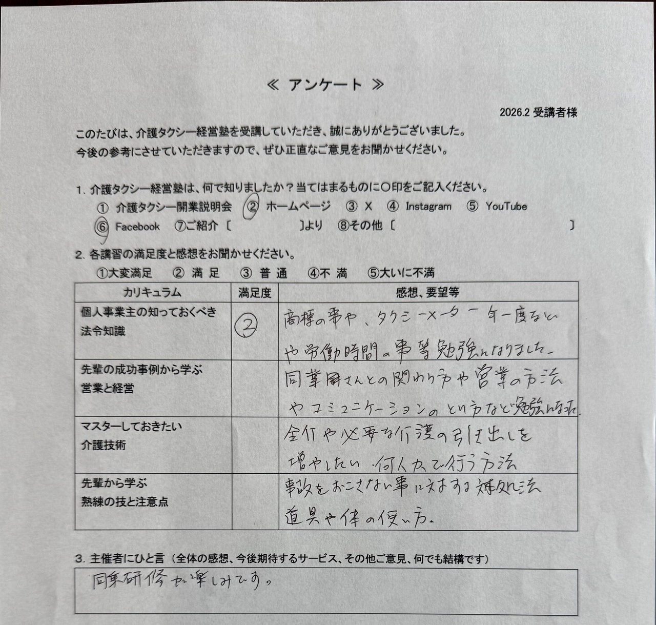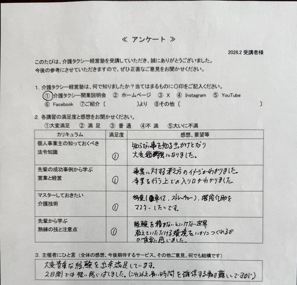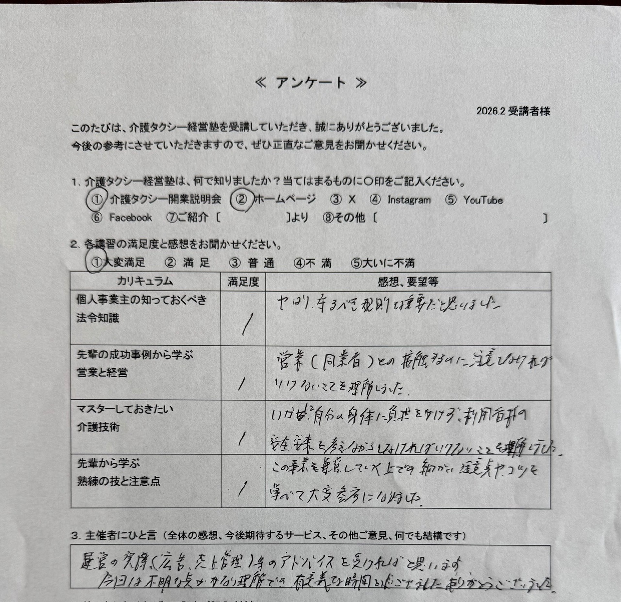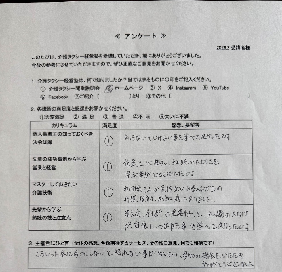 当会で開催している介護タクシー初心者向けスクール「介護タクシー経営塾」の受講生の声を掲載します。