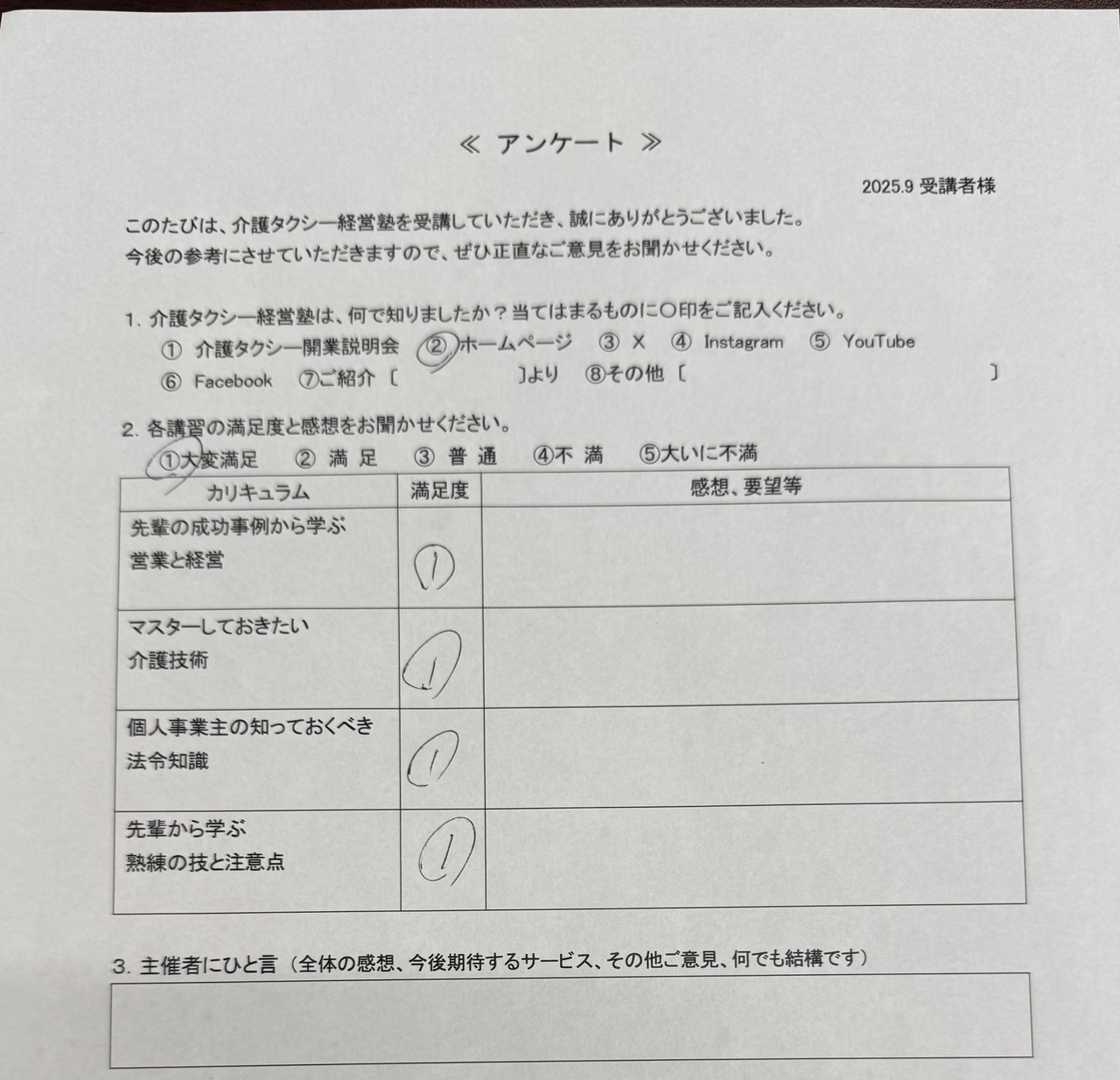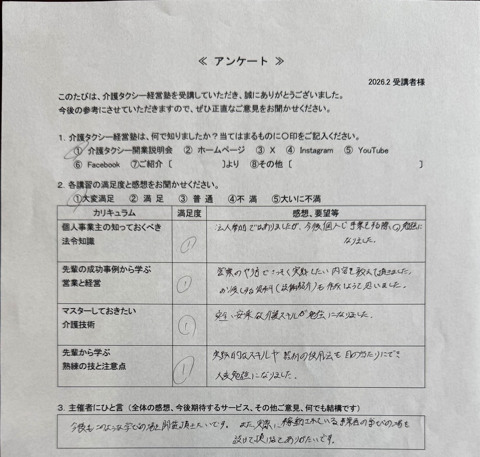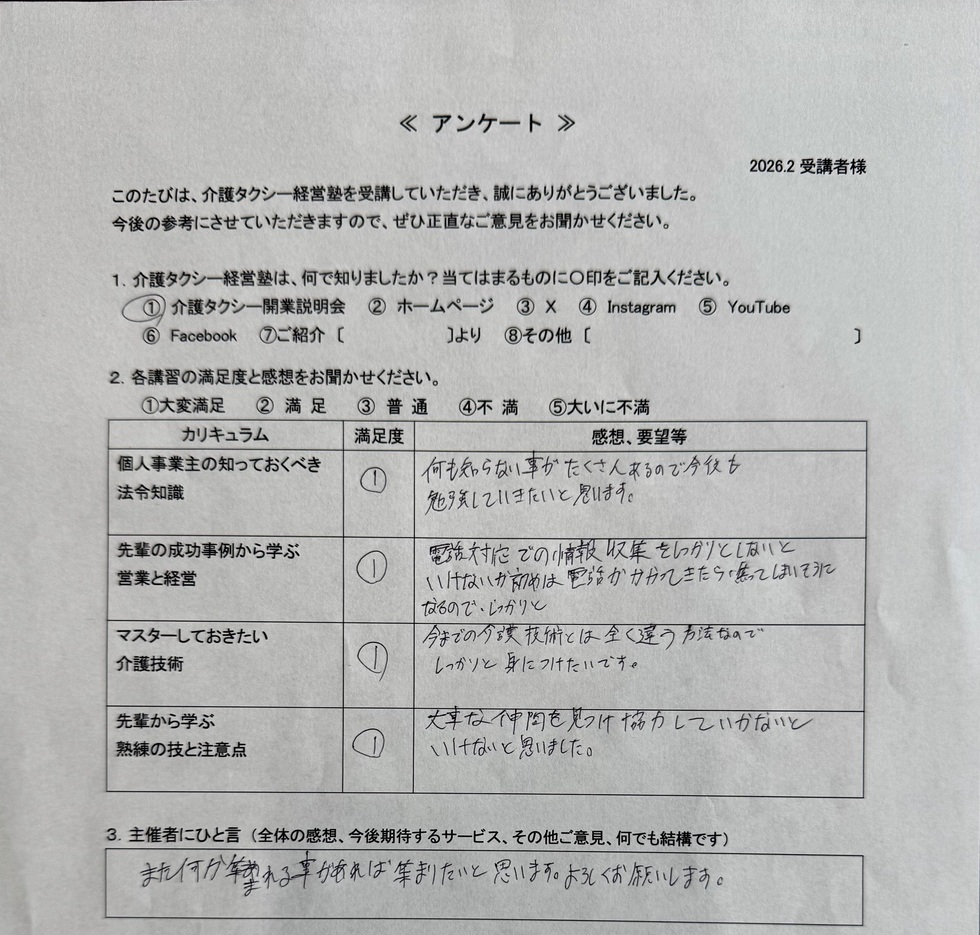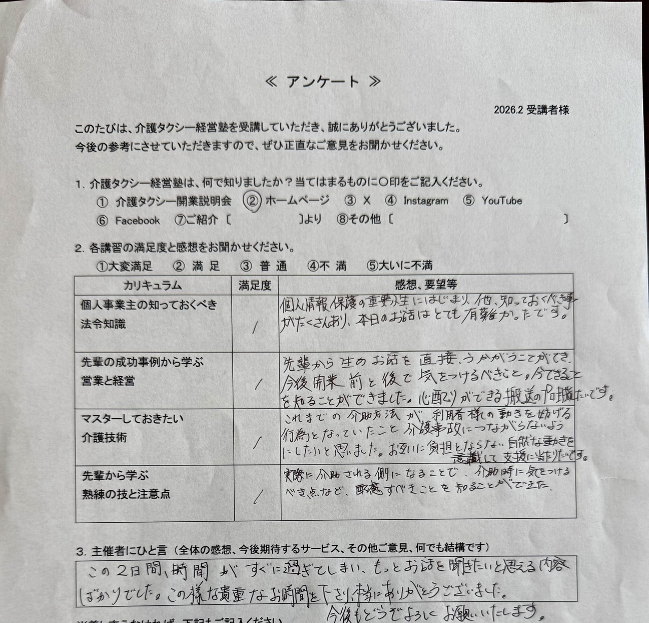 当会で開催している介護タクシー初心者向けスクール「介護タクシー経営塾」の受講生の声を掲載します。