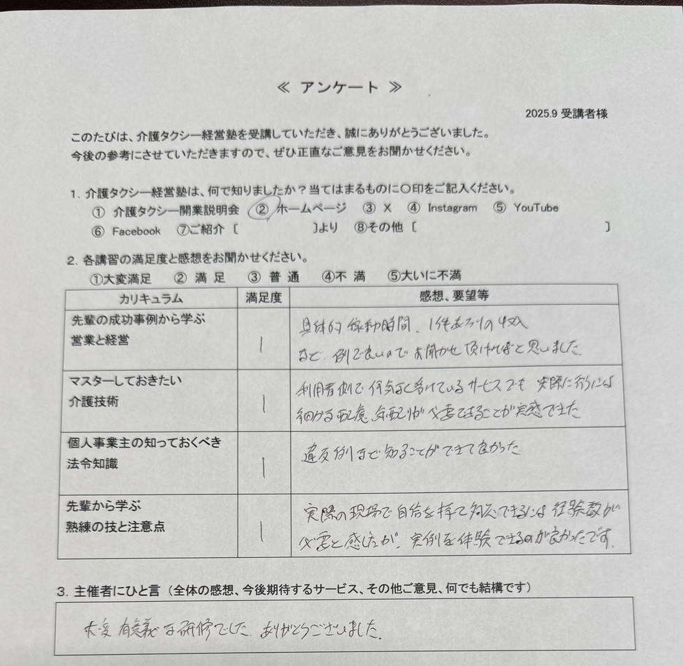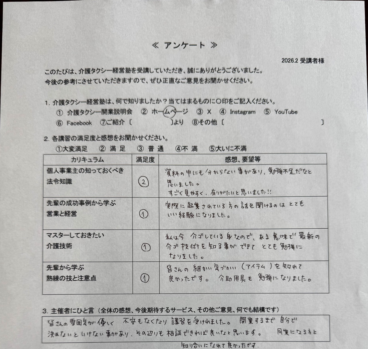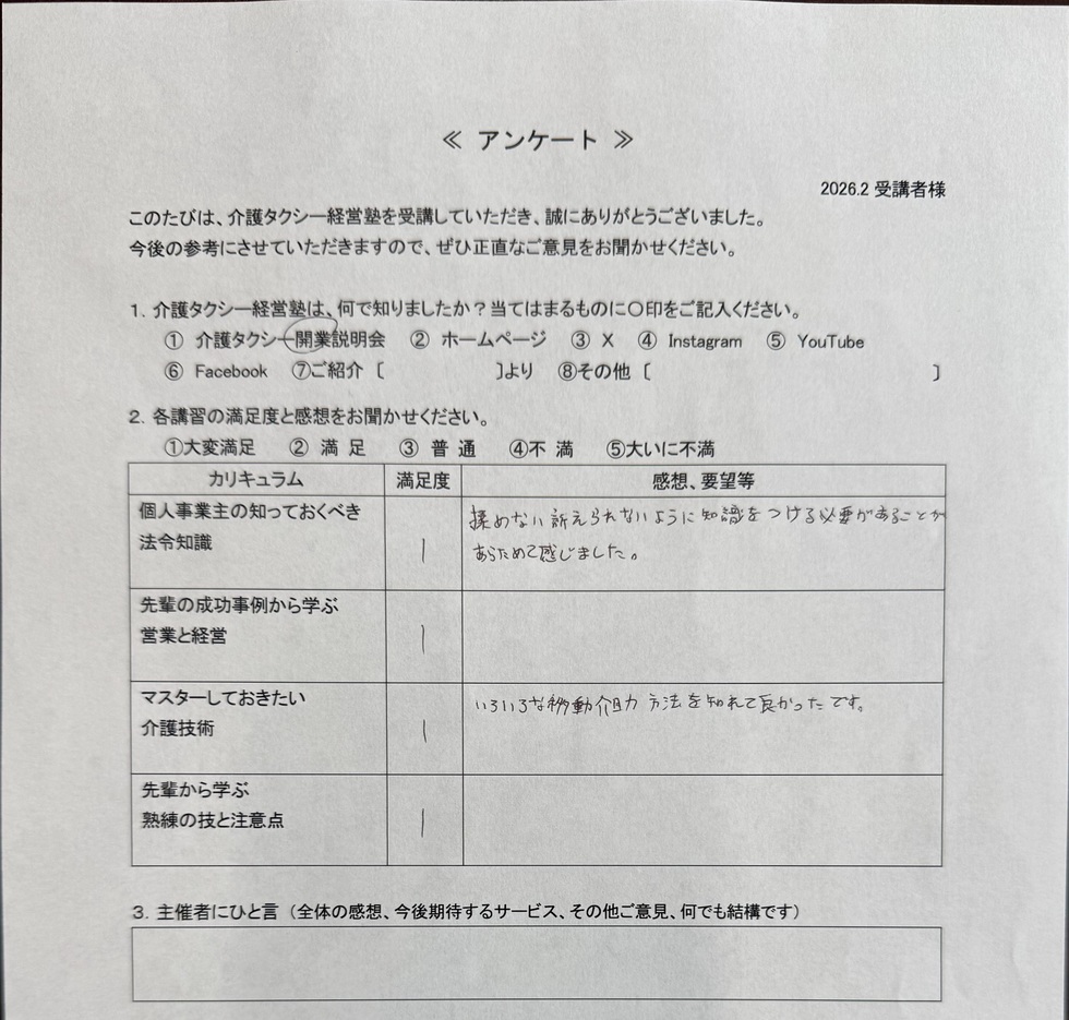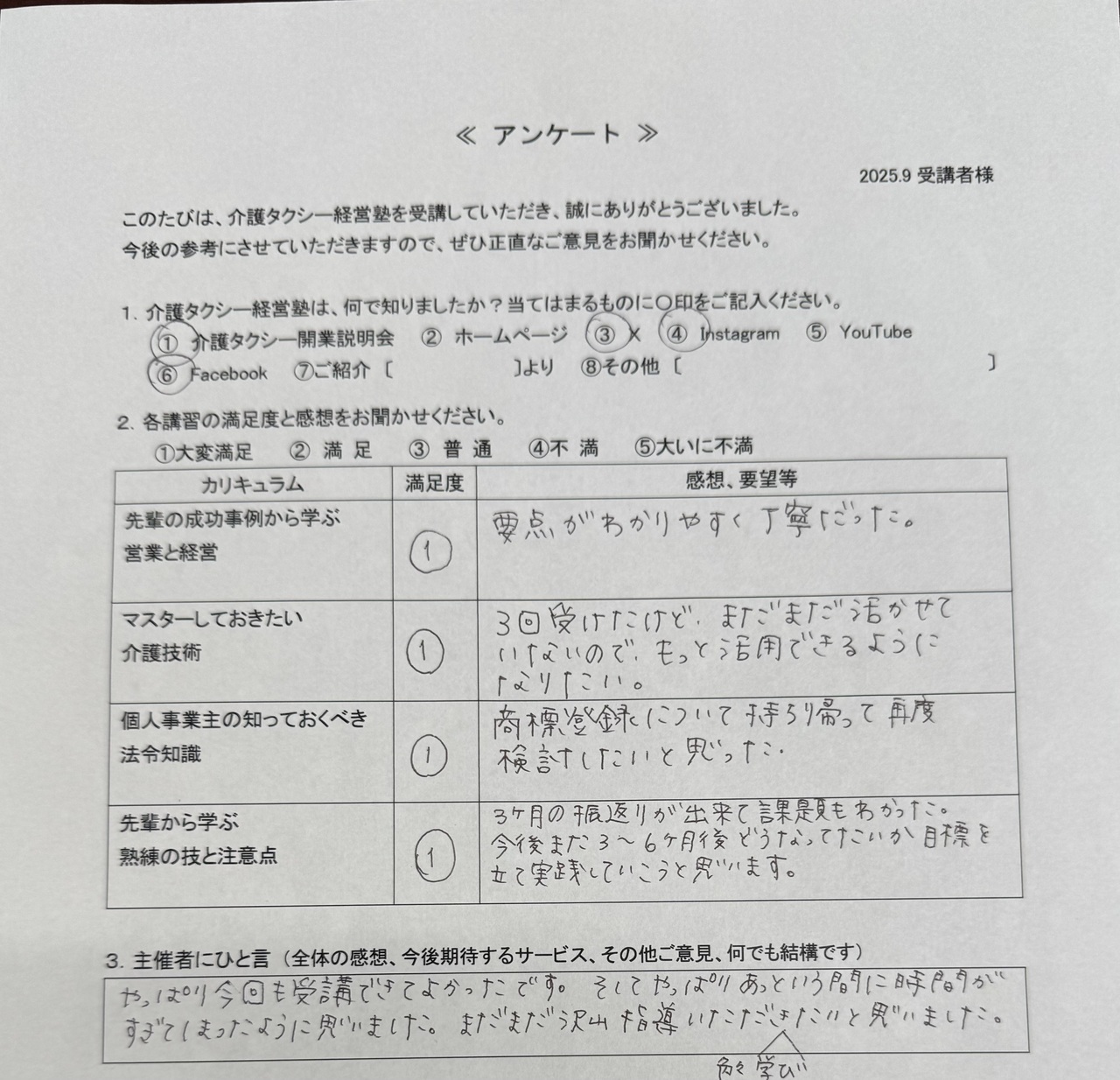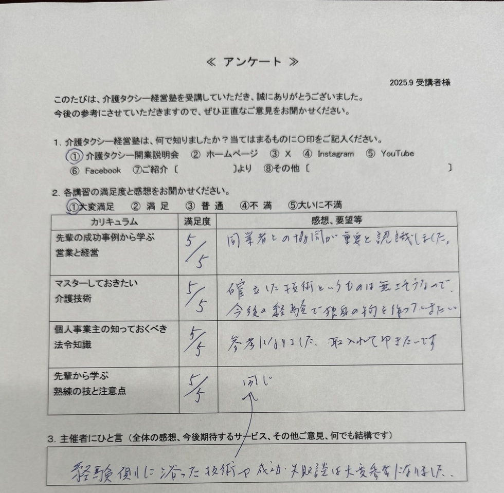 当会で開催している介護タクシー初心者向けスクール「介護タクシー経営塾」の受講生の声を掲載します。